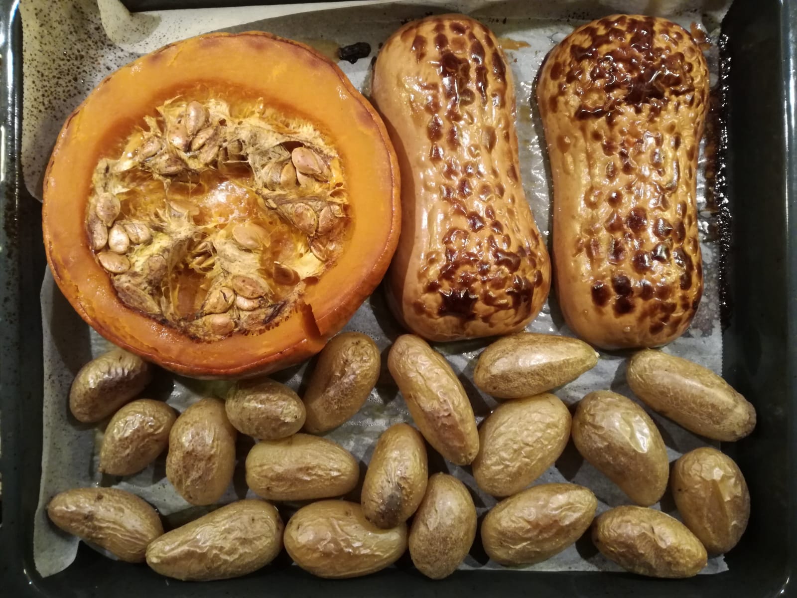Cuando vayamos a meter la bandeja, bajamos la temperatura a 180ºC y dejamos durante 15-20 mín. o hasta que veamos la corteza de la calabaza dorada.